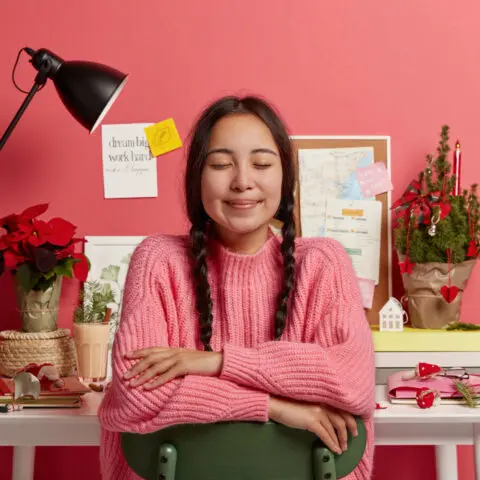 Productivity Habits and Rituals: Calm person at organised desk with free time, showing control and accomplishment.