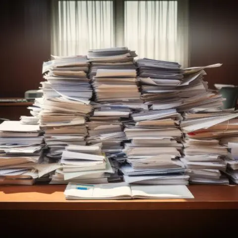 Piles of paperwork on an accountant's desk